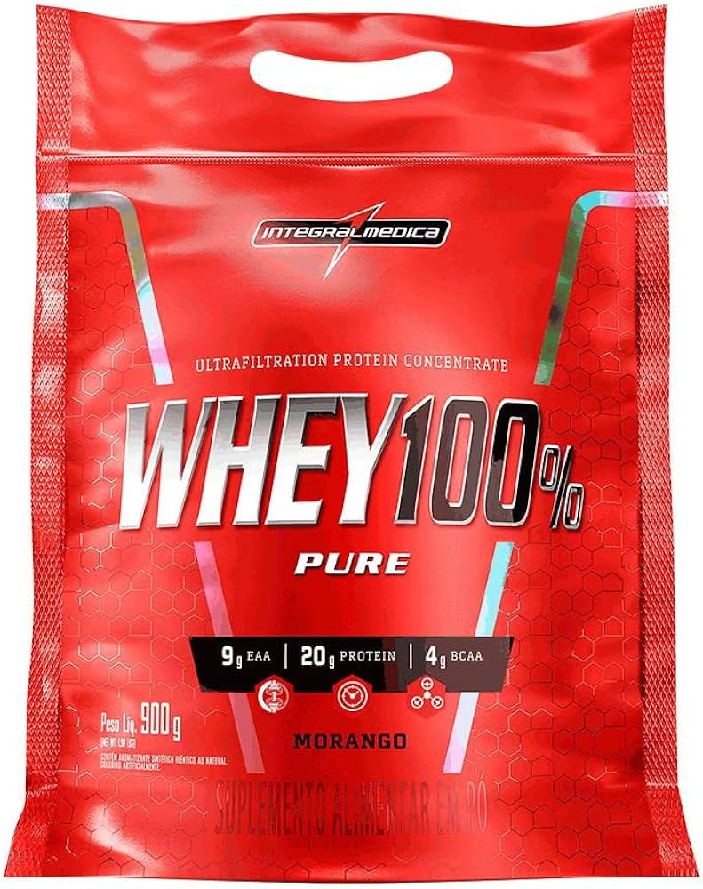 Whey 100% Pure Integralmédica está disponível em 6 sabores, versões pote de 900g, pote de 450g, Pouch de 900g e Pouch de 1,8kg.